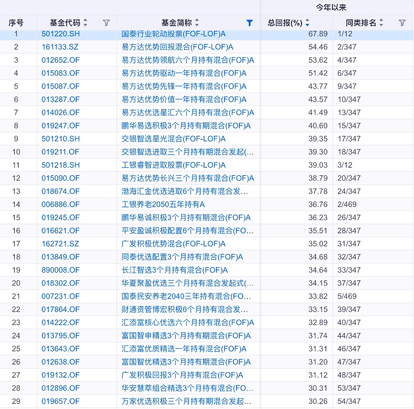 表现最好的是曾辉管理的国泰行业轮动股票(FOF-LOF)今年以来回报率67.89%,同类排名第一。随后,易方达包揽了第二至第七名,排名第二的是胡云峰管理的易方达优势回报混合(FOF-LOF),其余5只均是张浩然管理,易方达优势领航六个月持有混合(FOF)、易方达优势驱动一年持有混合(FOF)、易方达优势先锋一年持有混合(FOF)、易方达优势价值一年持有混合(FOF)以及易方达优选星汇六个月持有混合(FOF)。