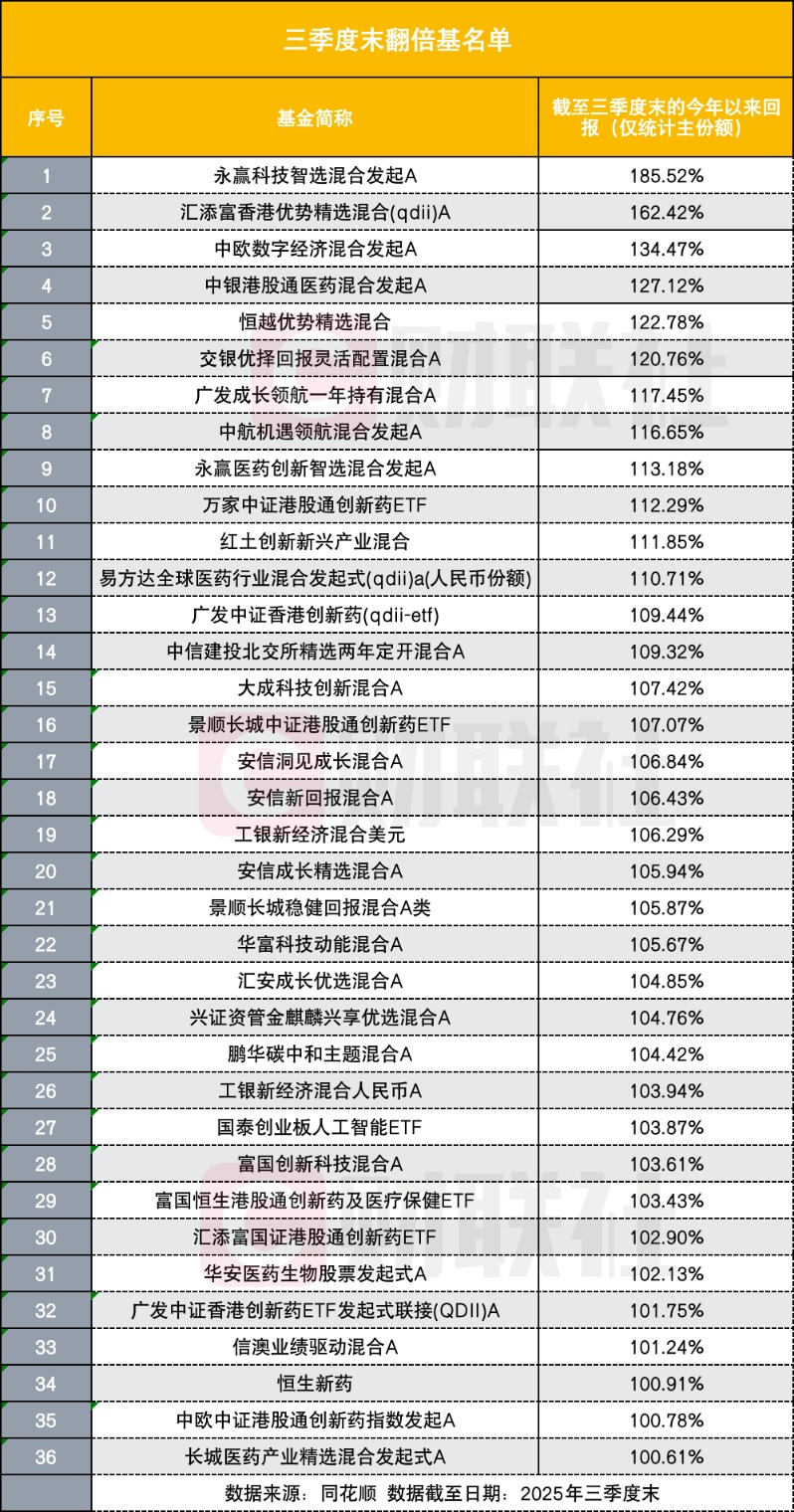 同花顺数据显示,截至今年三季度末,共有36只年内收益超100%的翻倍基,其中包含28只主动型产品和8只被动型产品。