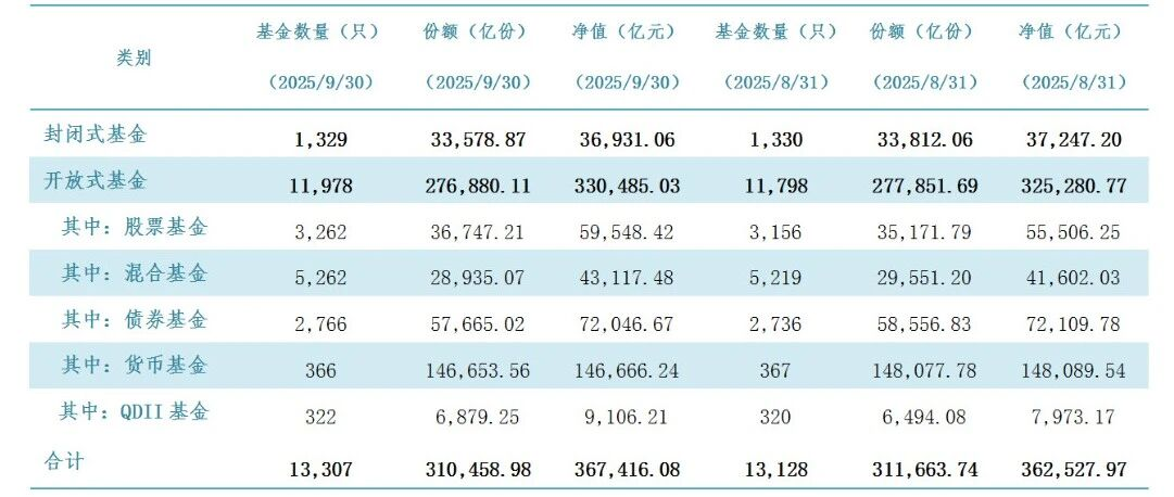 股票型基金方面,资金流入和新产品发行推动其总份额实现显著增长。9月底,该类基金的总份额为3.67万亿份,与8月底的3.52万亿份相比增长1575亿份。