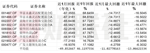 值得警惕的是,部分基金的单月回报跌幅与最大回撤数据出现明显背离。以华富永鑫灵活配置混合C为例,近一月回报为-67.36%,而同期最大回撤仅为-14.73%;前海开源金银珠宝混合A也呈现类似特征,近一月回报为-65.58%,最大回撤为-14.85%。