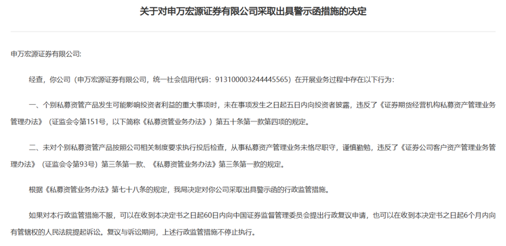 上海证监局发布的罚单显示,申万宏源证券因私募资管业务存在两项违规行为,被出具警示函,涉及重大事项披露不及时与投后检查不到位,这也是年内券商私募资管领域违规案例的又一代表罚单。