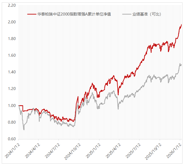 与同期业绩比较基准相比,从2024年1月12日成立以来,基准涨跌幅仅为47.99%,华泰柏瑞中证2000指数增强A跑出了优异的超额收益,同时较好的进行了风险控制,在市场大幅回调之际依然有望保持相对稳定的超额。