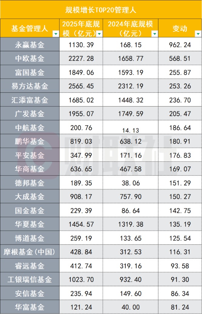 另外,华夏基金、景顺长城基金、嘉实基金、兴证全球基金、永赢基金、南方基金、工银瑞信基金等7家基金管理人旗下主动权益基金规模也超过千亿元。其中,永赢基金更是实现了10个位次的跃升,至行业第十,规模增至超900亿元;华夏基金的规模排名也较2024年提升1位,规模增长超百亿。
