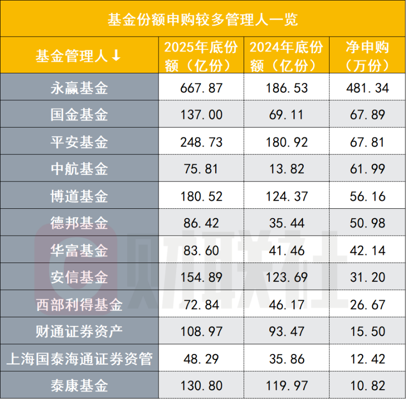 如果从基金份额变动来看,永赢基金旗下主动权益基金去年被申购最多,相关基金份额在去年增加481.33亿份,这也是主动权益基金管理人中唯一一家被净申购超百亿份的。