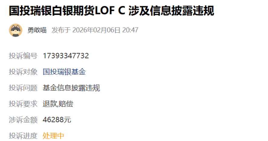 投资者因白银 LOF 基金净值大跌遭受巨幅损失,纷纷发起维权。有投资者在“消费保”等第三方投诉平台发起投诉,数量迅速突破1.7万条。还有一些投资者通过社交媒体发声,质疑基金公司信息披露滞后、在交易结束后才公告调整,导致投资者在不知情下遭受超额损失。