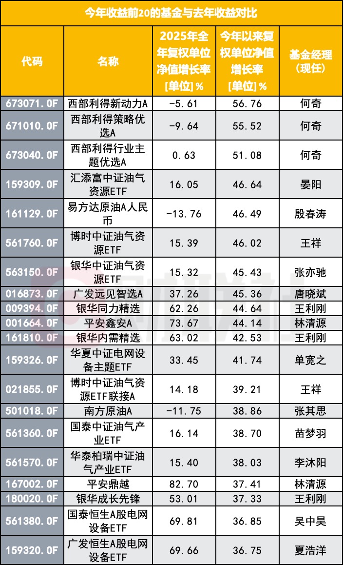 与此同时,多只油气主题ETF也集体占据前排,包括汇添富中证油气资源ETF今年以来收益46.64%,博时中证油气资源ETF收益46.02%,银华中证油气资源ETF收益45.43%,国泰中证油气产业ETF收益38.70%,华泰柏瑞中证油气产业ETF收益38.03%。这些产品去年大多并不属于市场焦点,但今年随着资金偏好转向资源、能源和部分周期品种,原本沉寂的板块迅速成为收益的重要来源。