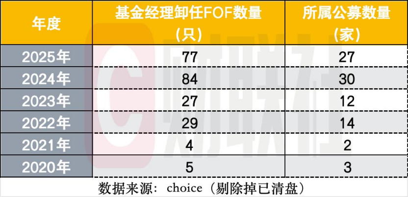剔除已清盘产品,2020年、2021年出现基金经理卸任的FOF共计9只;在2022年至2024年行业调整期,FOF基金经理流动显著加剧,分别有29只、27只、84只FOF出现基金经理卸任,且多见基金经理离职、跳槽。到了2025年,出现基金经理卸任的FOF数量从峰值回落至77只。