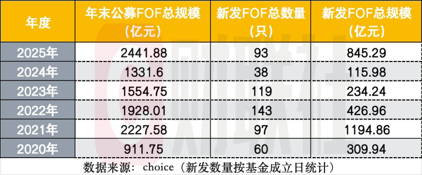 数据显示,2020年至2025年新成立FOF分别有60只、97只、143只、119只、38只、93只,对应发行规模依次为309.94亿元、1194.86亿元、426.96亿元、234.24亿元、115.98亿元、845.29亿元。
