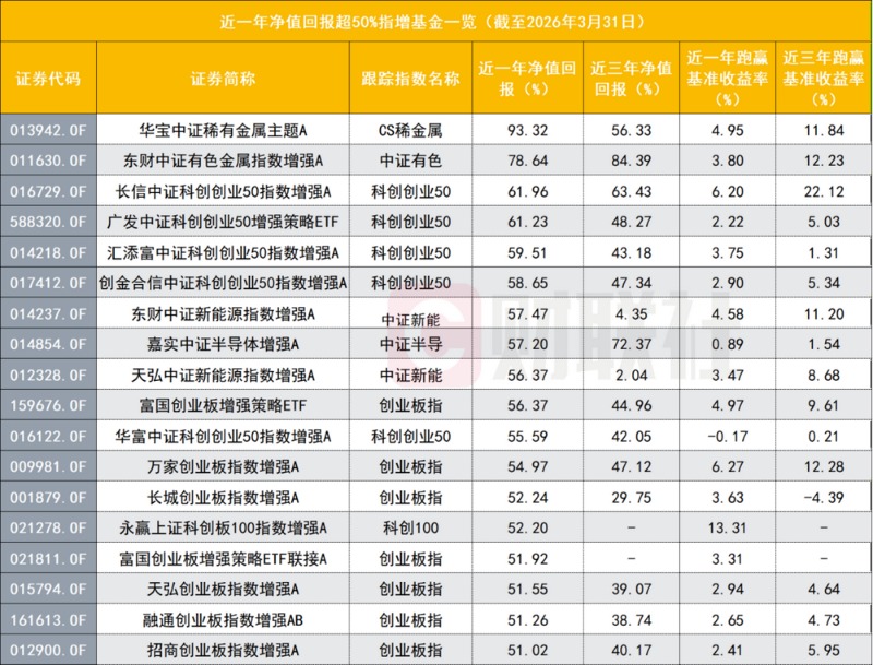 而跟踪创业板指的则有7只净值回报居前,其中,富国创业板增强策略ETF近一年回报超56%;万家创业板指数增强和长城创业板指数增强近一年回报也超过52%。