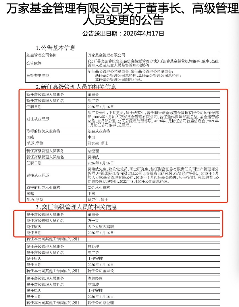 4月17日凌晨,万家基金发布高管变动公告称,公司董事长方一天卸任,由原总经理陈广益接任董事长一职,公司原副总经理莫海波升任公司总经理。