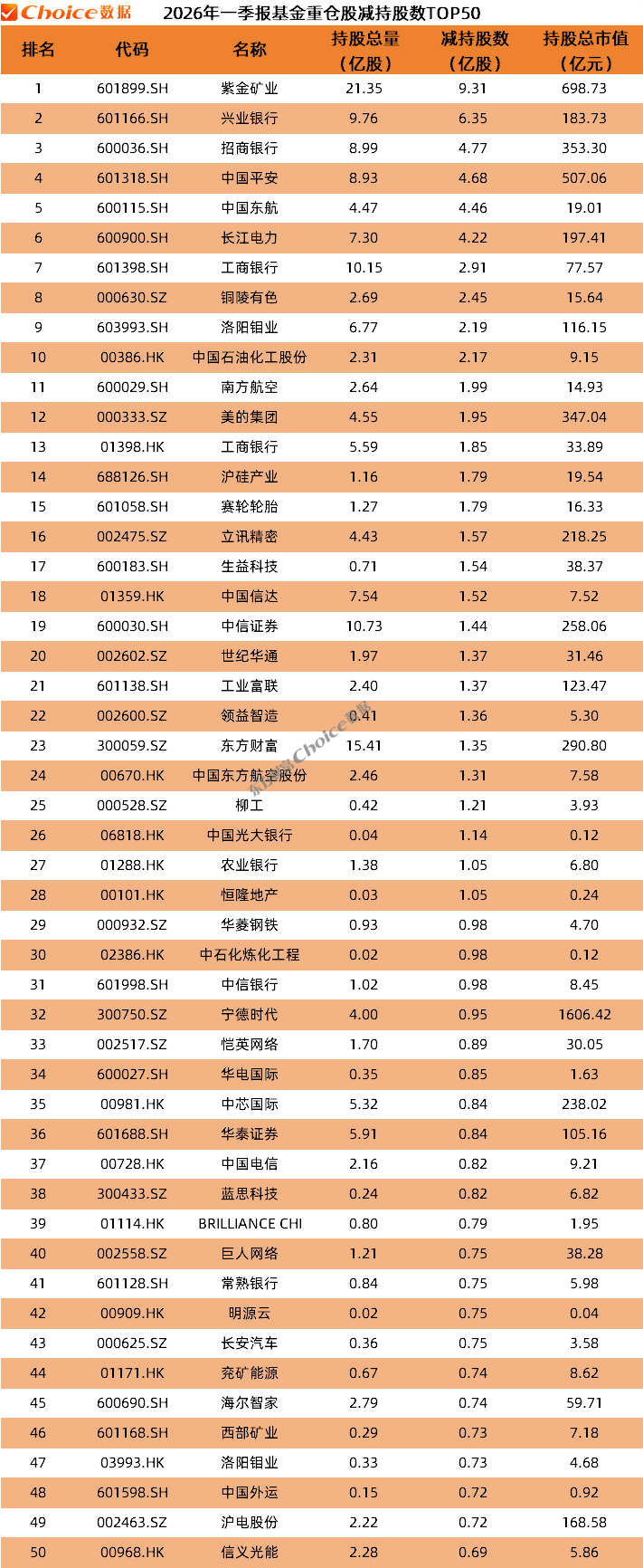 在个股减持TOP50的榜单中,紫金矿业被减持股数最多,2025年年报,基金重仓持有该股30.66亿股,2026年一季度降至21.35亿股,减持了9.31亿股;其次,兴业银行被减持6.35亿股,招商银行、中国平安、长江电力等被减持超4亿股。