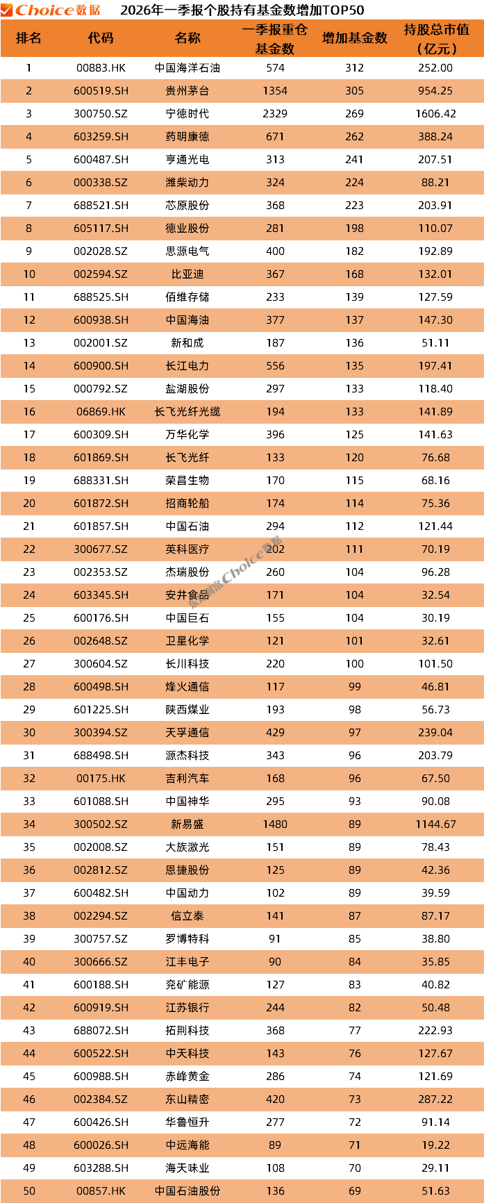 在个股重仓基金数量增加榜单中,港股中国海洋石油重仓基金数增加了312只,位列第一。该股2025年年报被262只基金重仓持有,一季度末增加至574只,持股总市值达到252亿元。重仓贵州茅台、宁德时代、药明康德、亨通光电等的基金数增加均超200只。