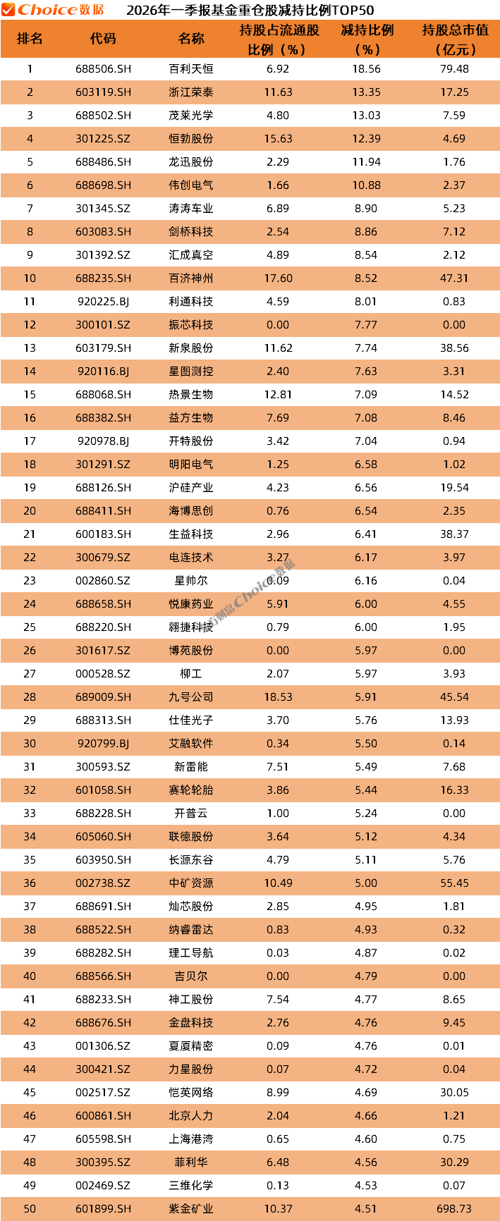 在个股占流通股比例减少TOP50的榜单中,百利天恒减持比例最高,2025年年报,基金重仓持有该股占流通比25.48%,2026年一季度末降至6.92%,减持了18.56%;浙江荣泰、茂莱化学、恒勃股份等减持超10%。