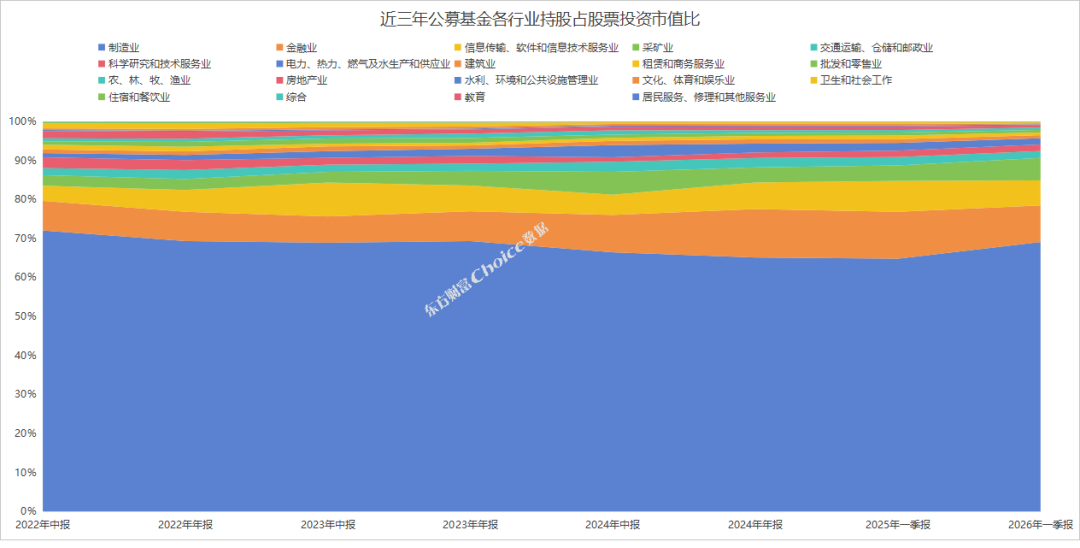 持股市值行业配置上,制造业、金融业、信息传输、软件和信息技术服务业占比位列前三,分别占比56.6%、7.7%和5.26%。
