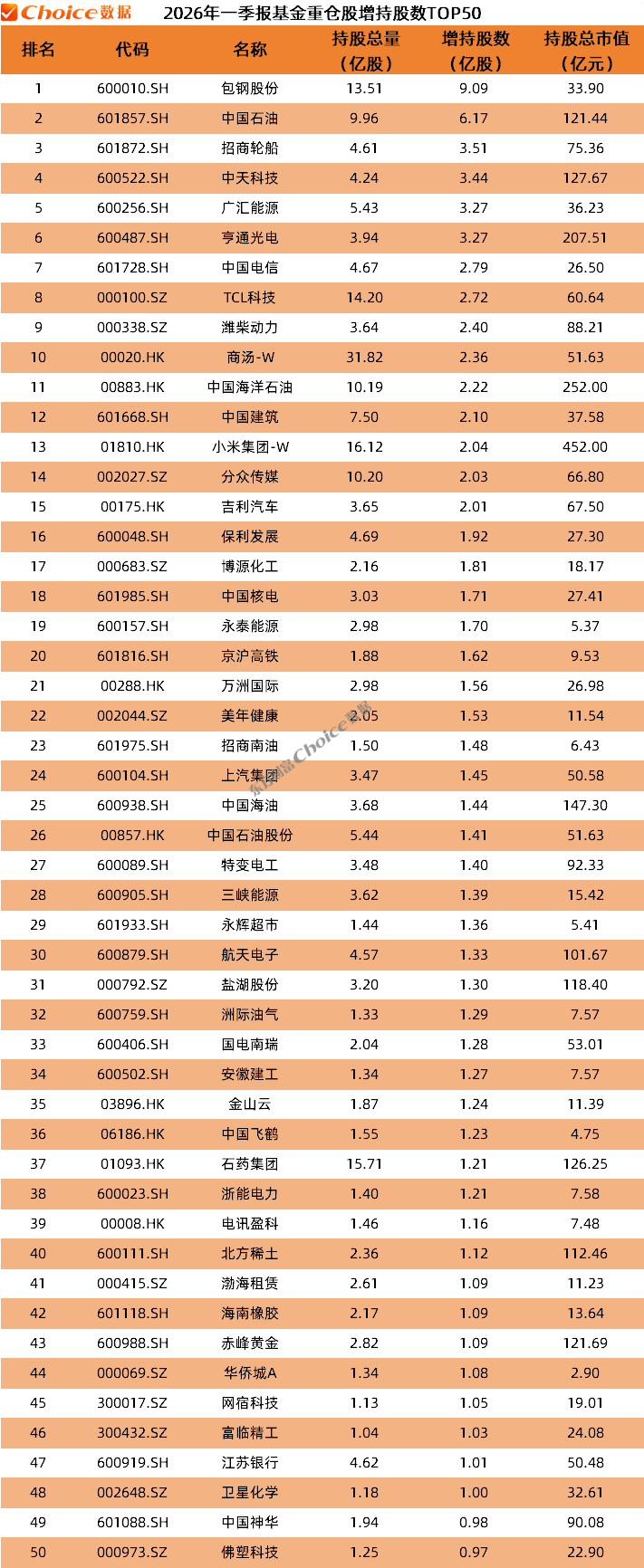 包钢股份增持股数位列第一,2026年一季度末,基金重仓持有该股数量从去年底的4.42亿股增加至13.51亿股,增持了9.09亿股,总市值达到33.9亿元。